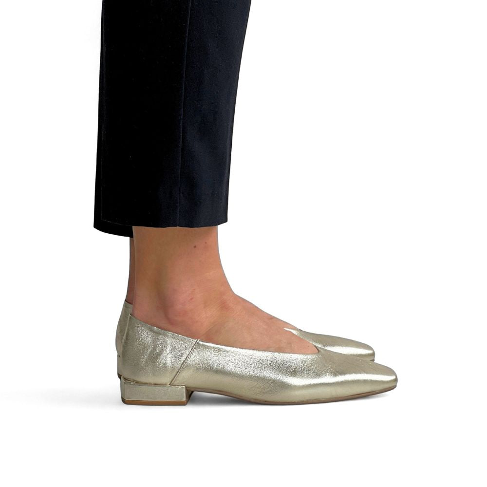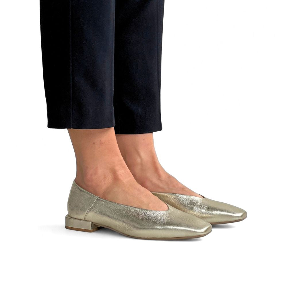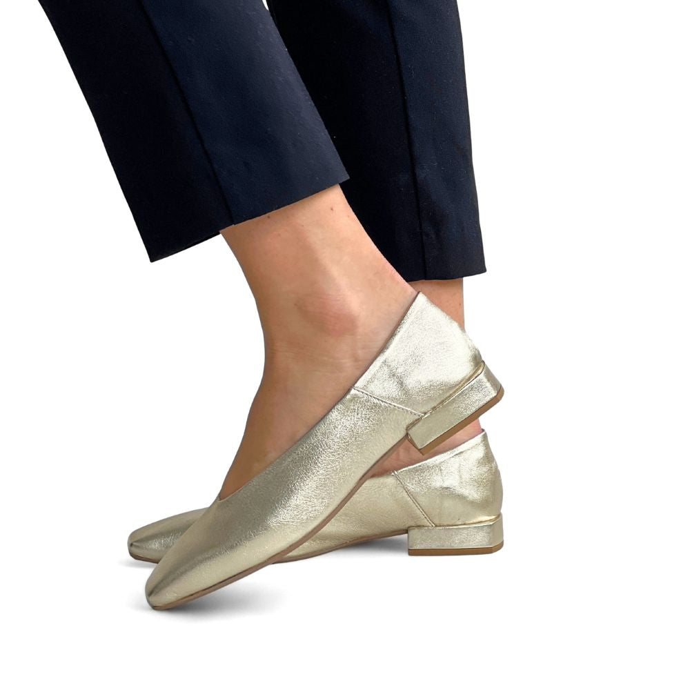 Laura er en elegant og klassisk ballerina i gull med slip-on design. Ballerinaskoen har firkantet tå og en stilig firkantet blokkhæl. Den myke skinnkvaliteten former seg fint etter foten og gjør dem behagelige å bruke gjennom hele dagen.