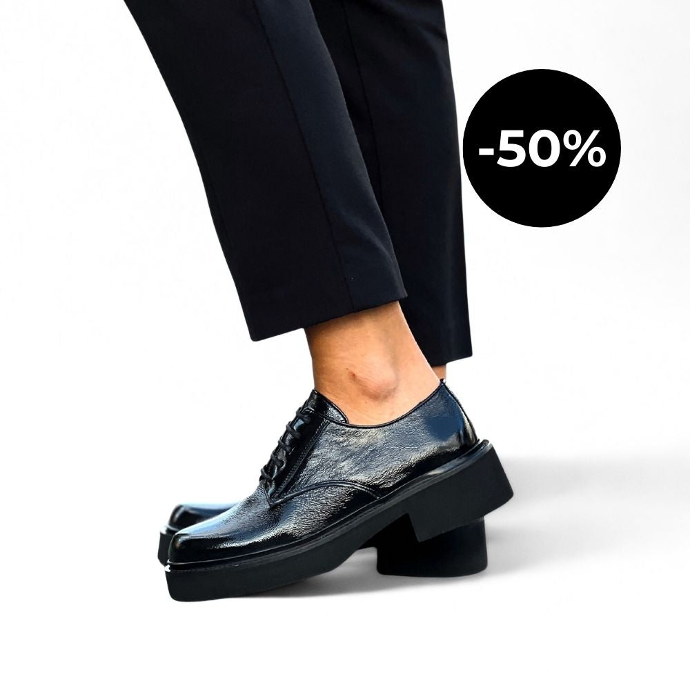 Juliet snøresko er klassiske, stilige lakksko i sort skinn. Skoene har rundt tåparti, snøring for god justering og en behagelig passform. Den sorte, solide, rene sålen gir god komfort, med en hælhøyde på 45mm. Overdelen og fòret er begge laget av skinn, noe som sikrer en luksuriøs følelse og holdbarhet.
